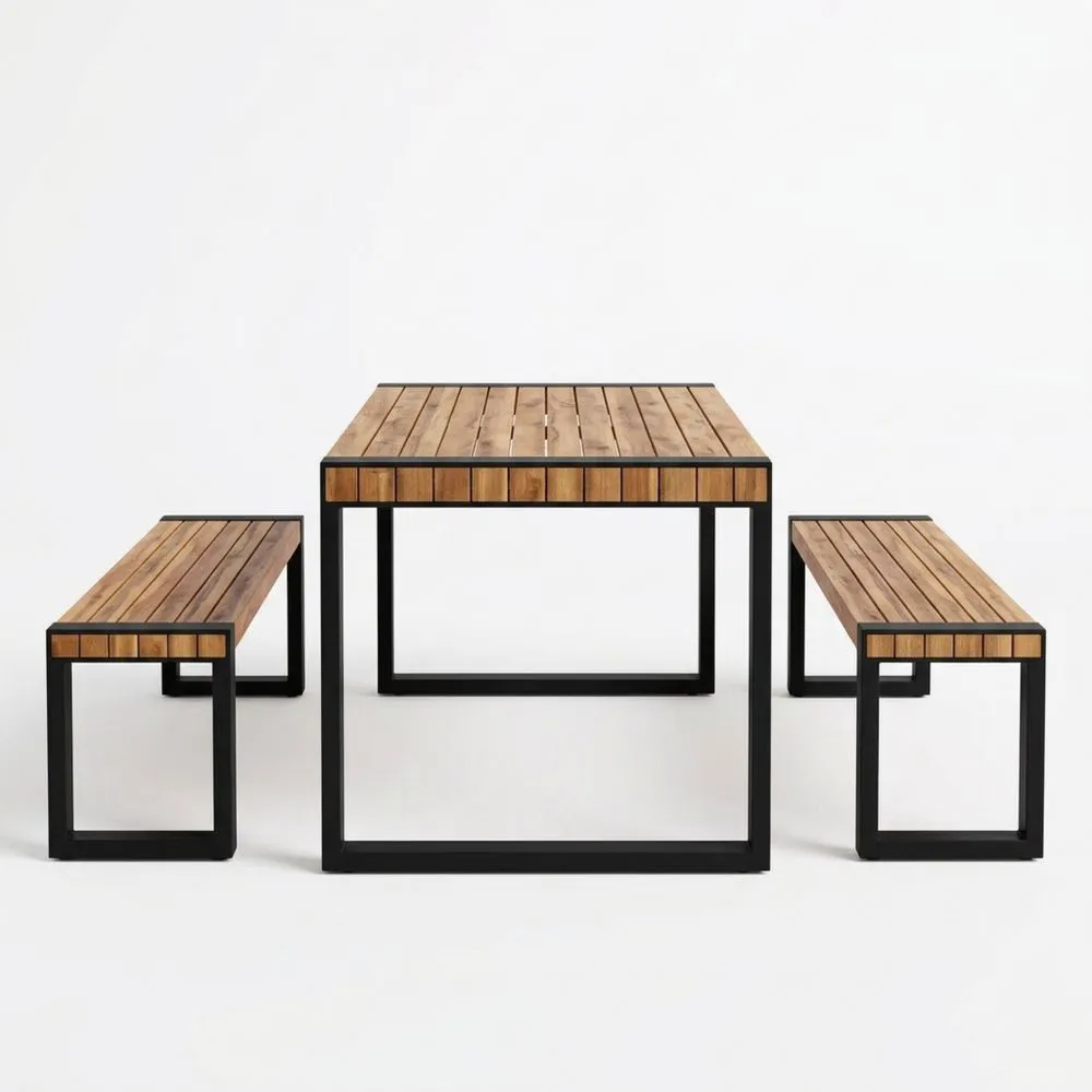 Garten-Essgruppe aus Akazienholz mit Tisch und 2 Bänken, Stahlrahmen